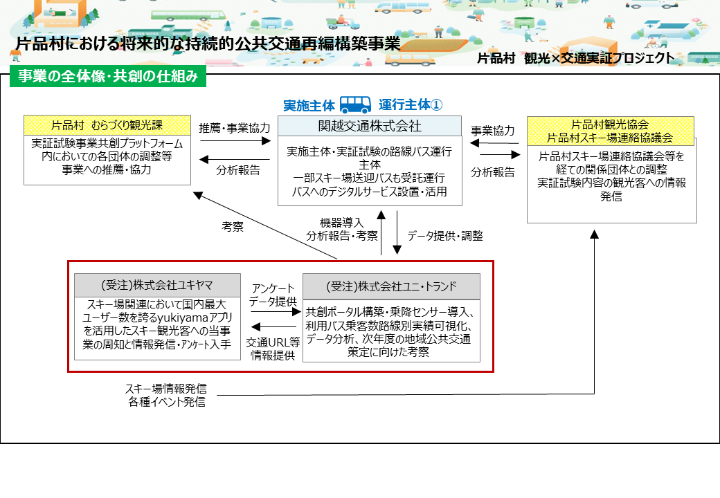 株式会社ユニリタ(東証スタンダード市場:3800、以下 ユニリタ)のグループ会社で、持続可能な地域社会の実現に向けて交通・物流の課題をデジタル技術で解決する株式会社ユニ・トランド(本社:東京都港区、代表取締役社長 高野 元、以下 ユニ・トランド)は、群馬県利根郡片品村をバスの運行エリアとする関越交通株式会社(本社:群馬県渋川市、取締役社長 佐藤俊也、以下 関越交通)を実施主体とする共創プラットフォーム「片品村 観光×交通実証プロジェクト(以下 本プロジェクト)※1」が行う「片品村における将来的な持続的公共交通再編構築事業(以下 本事業)」において、「バスロケーションシステム機器等の設置とそれに伴う乗降者管理のクラウドサービスの提供および各種分析業務」を受注し、参画いたします。