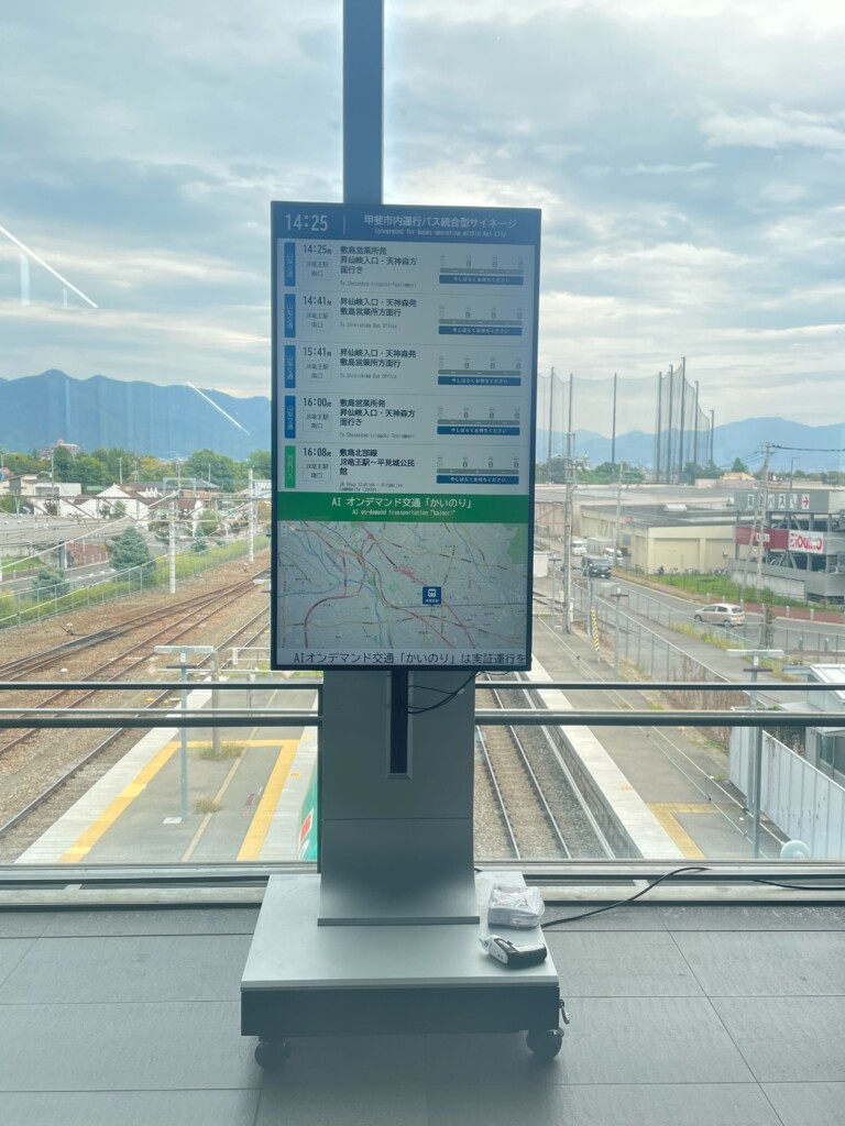 - ・甲斐市の隣の南アルプス市には鉄道路線がなく、南アルプス市のバスの一部がJR竜王駅を経由するためJR竜王駅のサイネージに該当便の運行情報を表示。