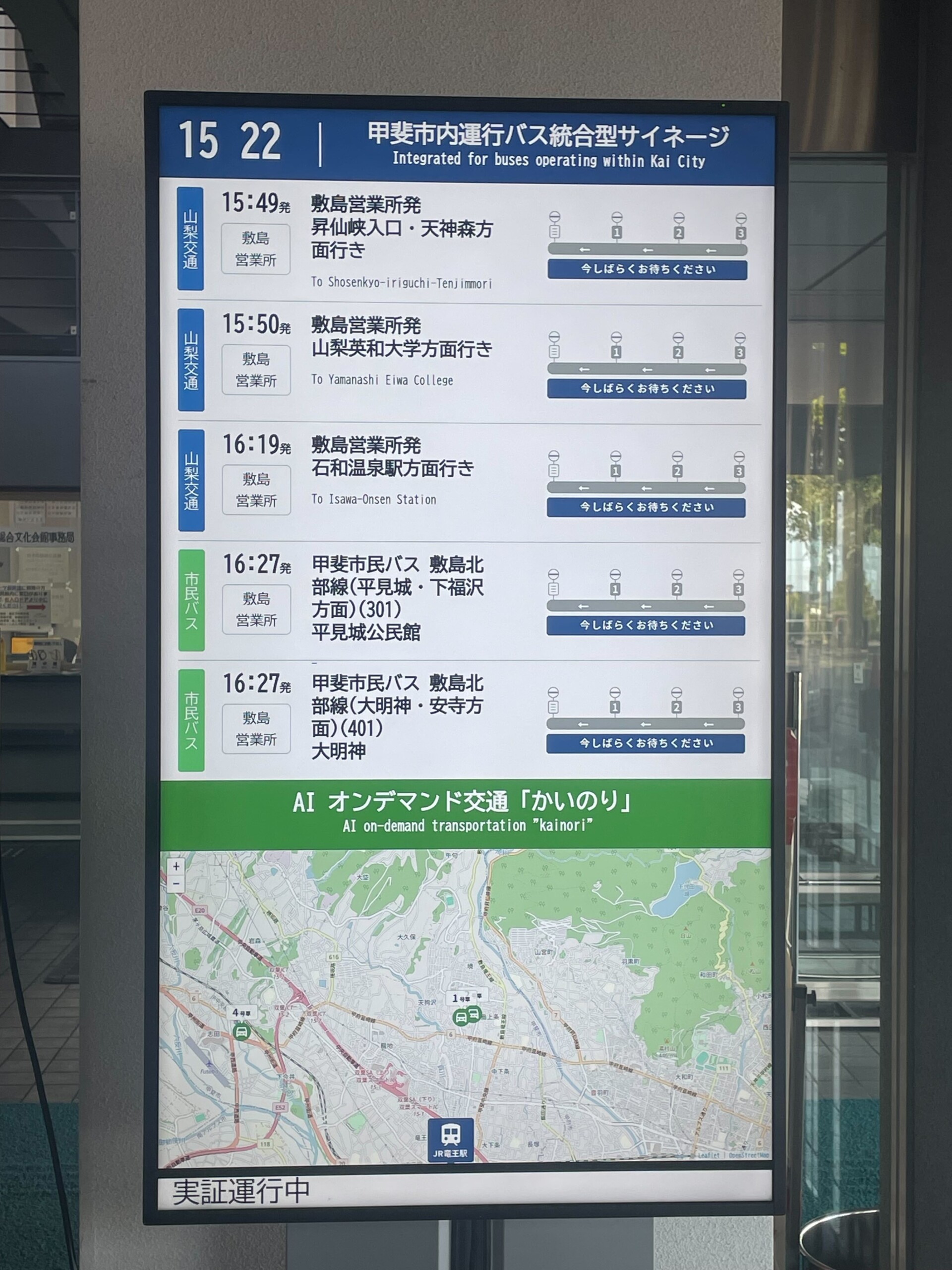 - ・「JR竜王駅」のサイネージには、①甲斐市運営のコミュニティバス ②山梨交通株式会社運営の路線バス ③南アルプス市運営のコミュニティバスの運行情報を統合して表示。