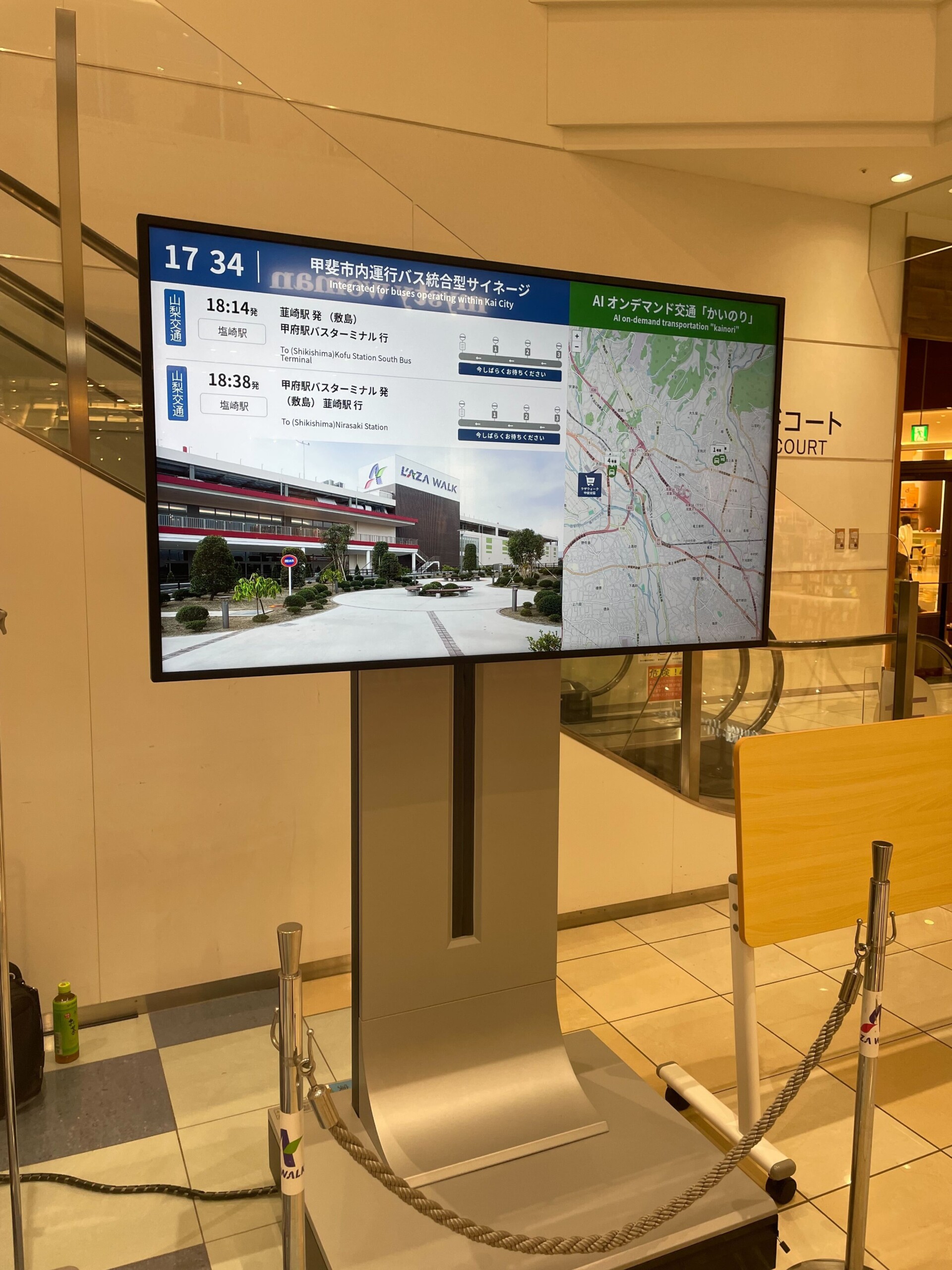 - ・「ラザウォーク甲斐双葉店」のサイネージには、同店を通るコミュニティバス(甲斐市民バス)と最寄り駅である塩崎駅を通る路線バス(山梨交通株式会社バス)の運行情報を統合して表示。